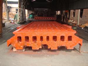 1100mm*600mm*820mm,主要壁厚为12mm,平导轨厚为45mm,V形导轨厚为55mm,铸件为箱型结构,毛重为550kg。采用干型铸造。由于该铸件结构强度较弱,芯子又比较多,容易产生裂纹,因此要求芯砂溃散性好,铸造内应力小,浇注后两小时内出芯砂,以防裂纹。铸件要求时效处理,要求铸铁牌号:HT150。